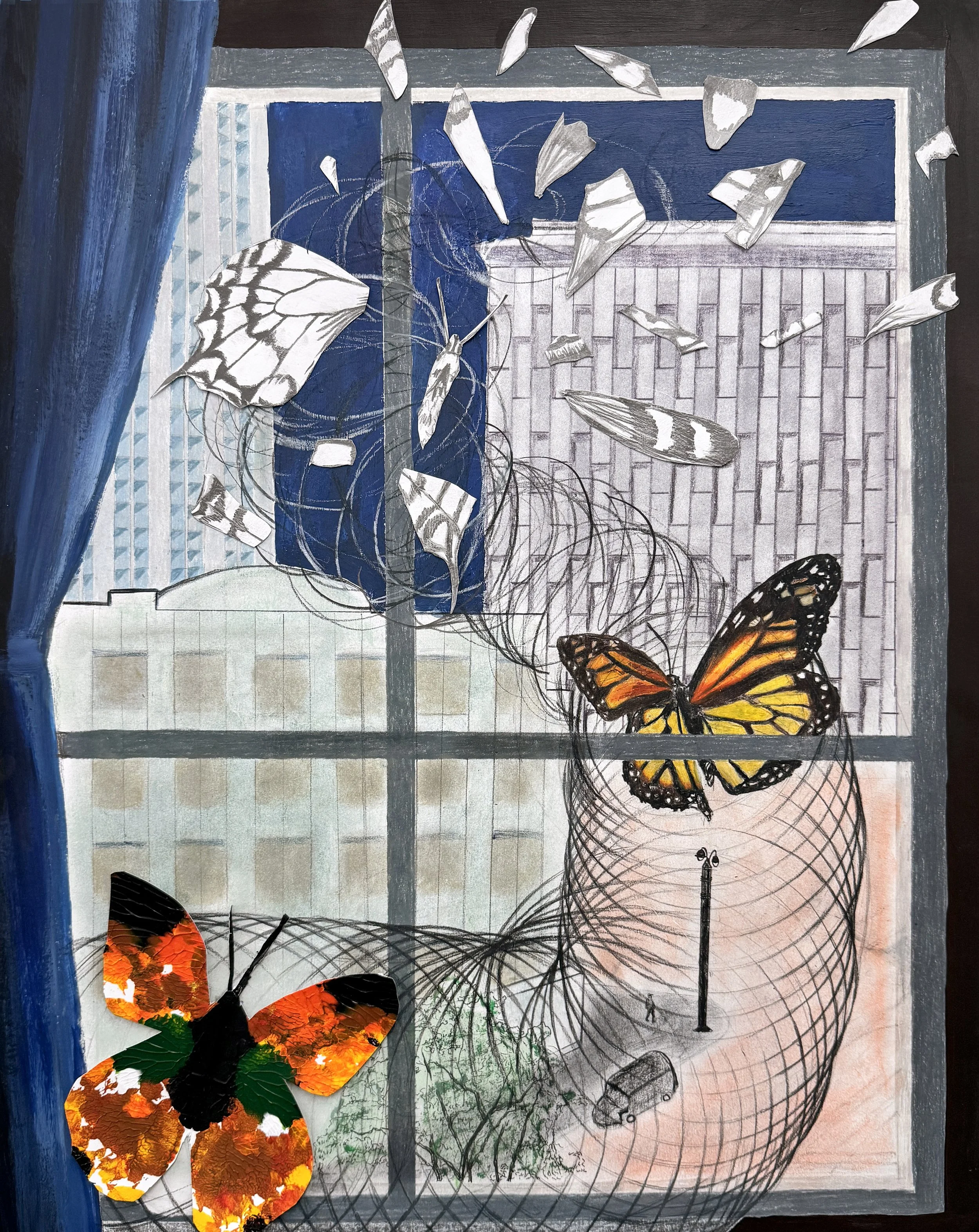 This piece originated as an observational drawing, looking out of a window, but grew with my imagination. I chose to include butterfies because I’ve always had an affinity for them, but, living in New York City, I rarely see them so I wanted to make a piece of art that combined the city and the insect.