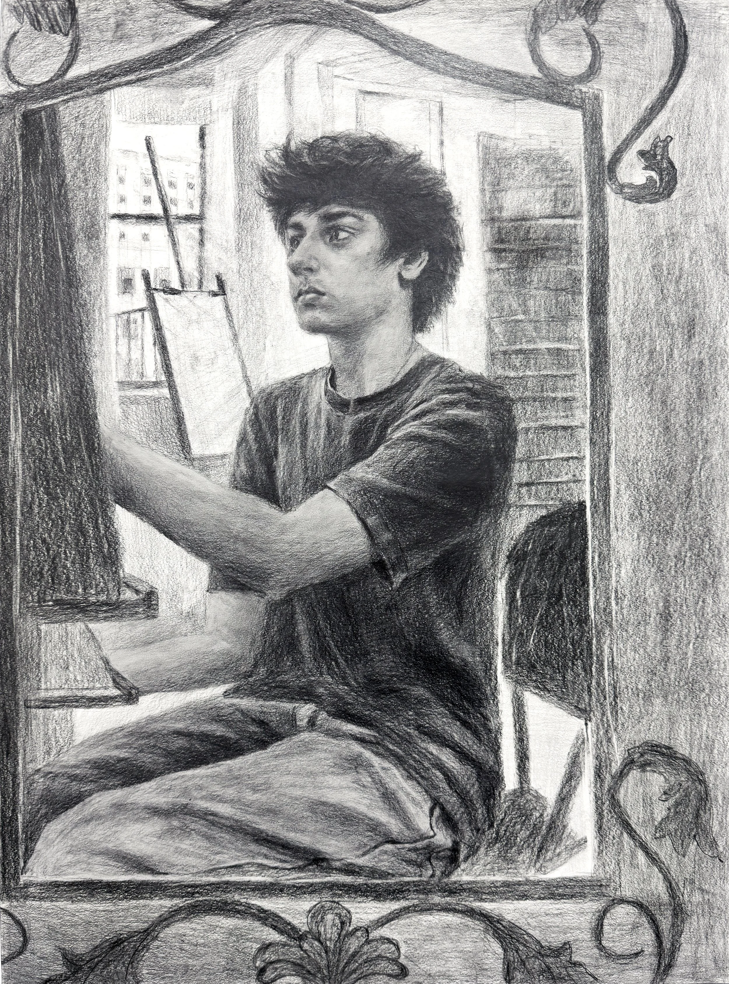 Observing myself in a mirror, I drew a detailed self portait in which the viewer’s eye is drawn to the lighting contrast and shadows on the clothing, hair, and face.