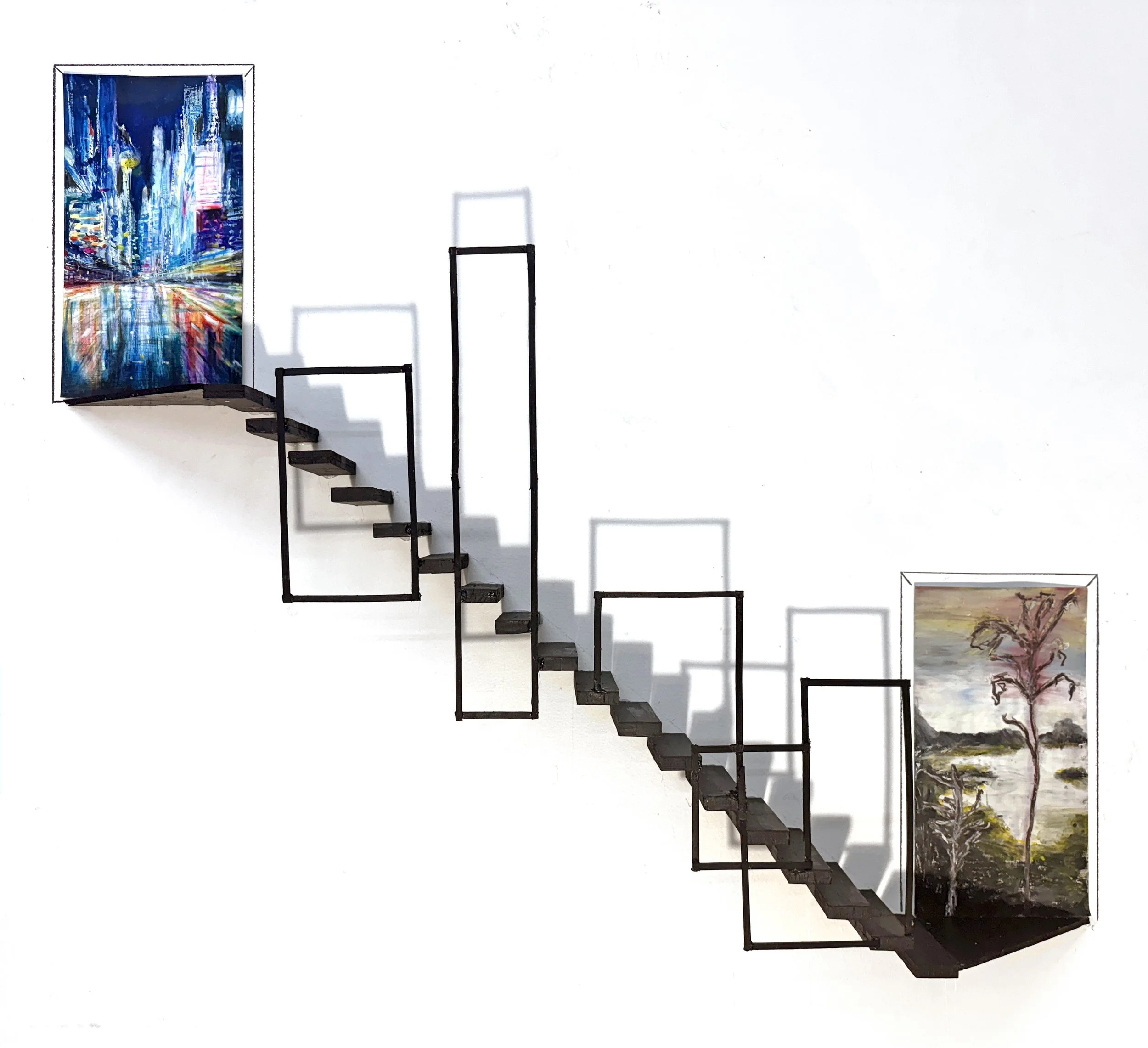I first created the two “portals” into very different but inviting scenes: a bright city street and a tranquil water bank. Then, with the goal of contrasting the two, I made stairs out of foamboard and wood sticks signaling the movement between city and nature.