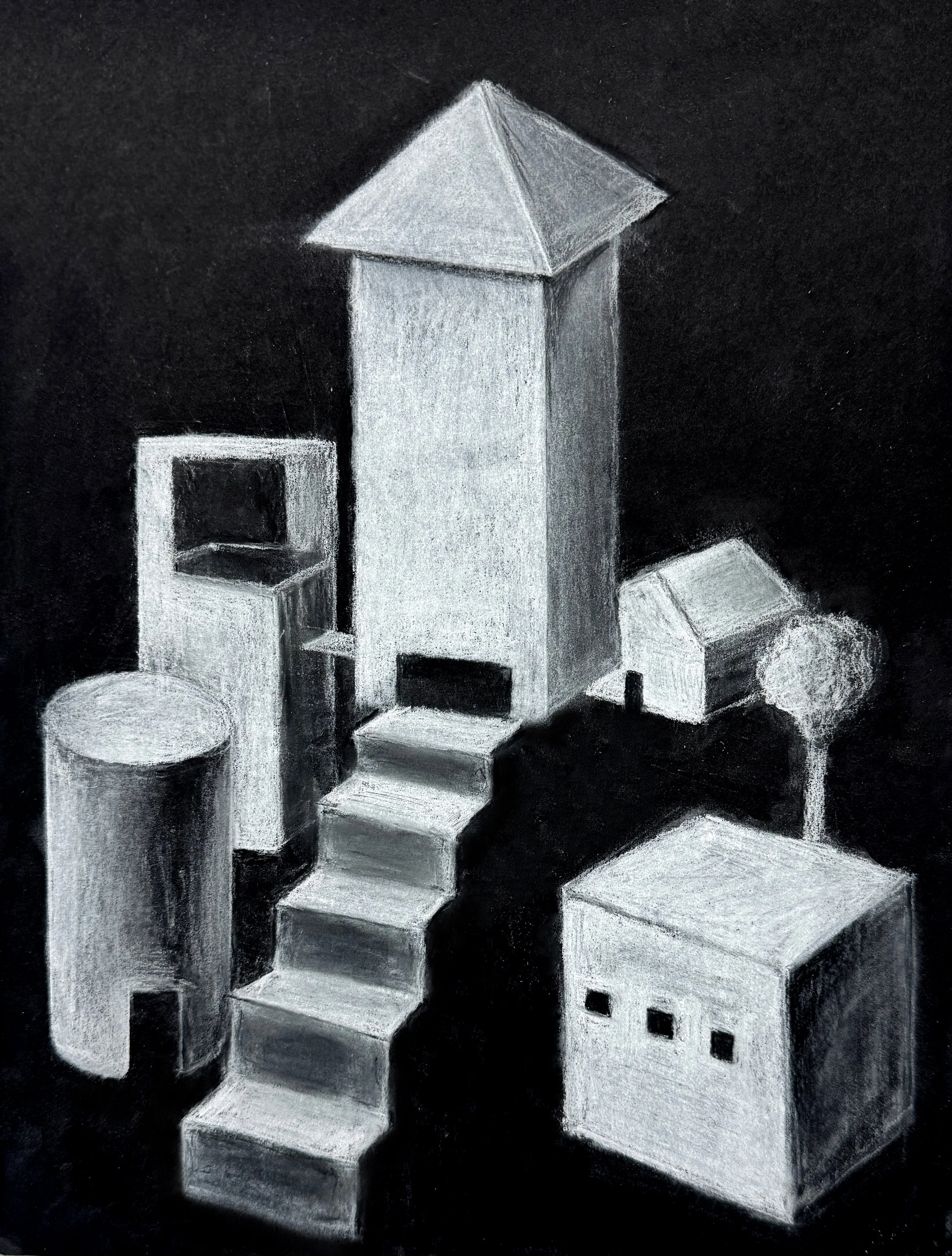 With the intent of deepening my understanding of how light hits objects, I used black paper and primarily white charcoal to draw a small deconstructed village composed of buildings and objects that would reflect light uniquely.