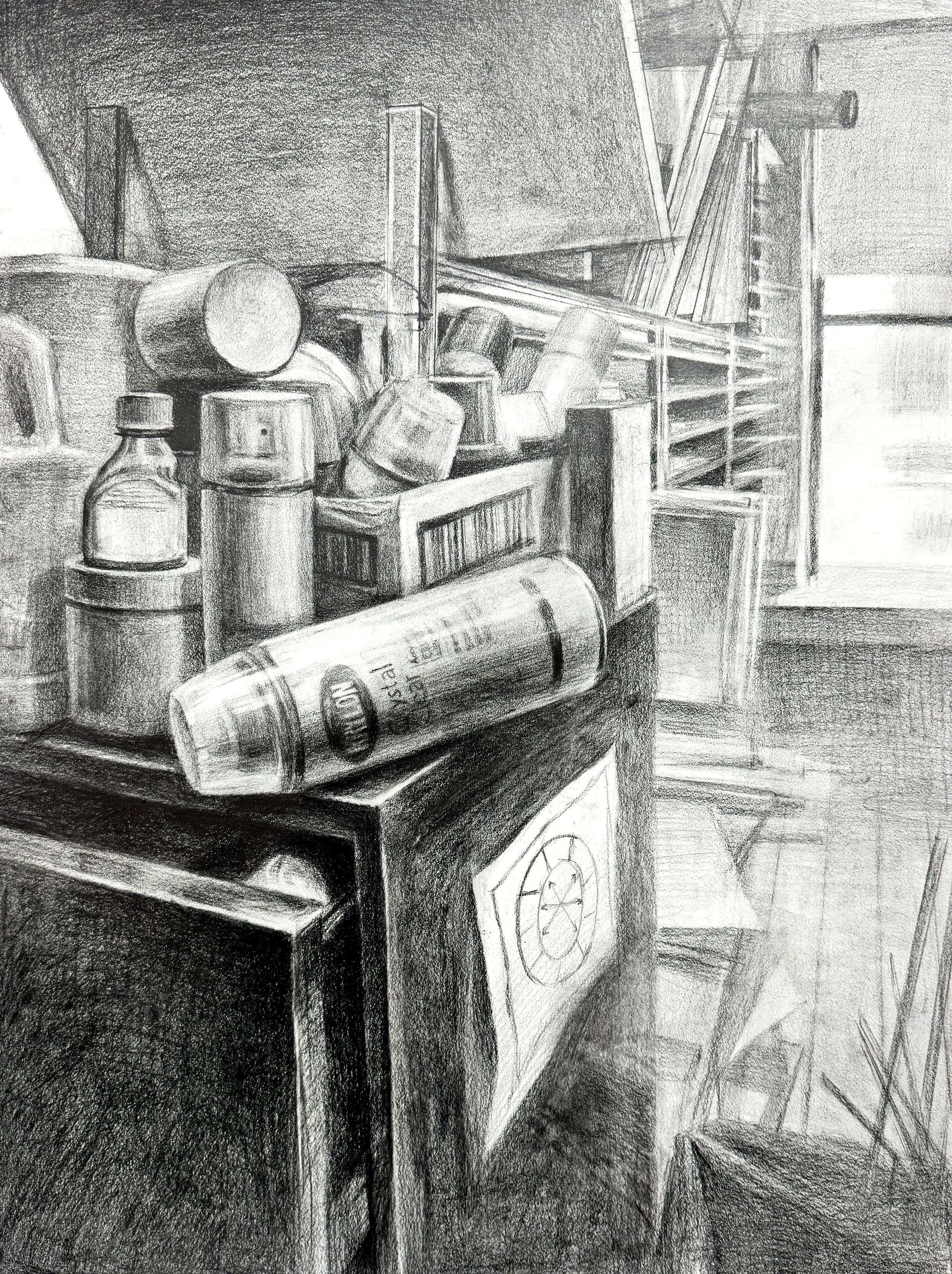 This is a still-life that highlights various cans and bottles in the foreground and establishes a vanishing point near the window which the shelving and boxes follow. The light is coming from the window.